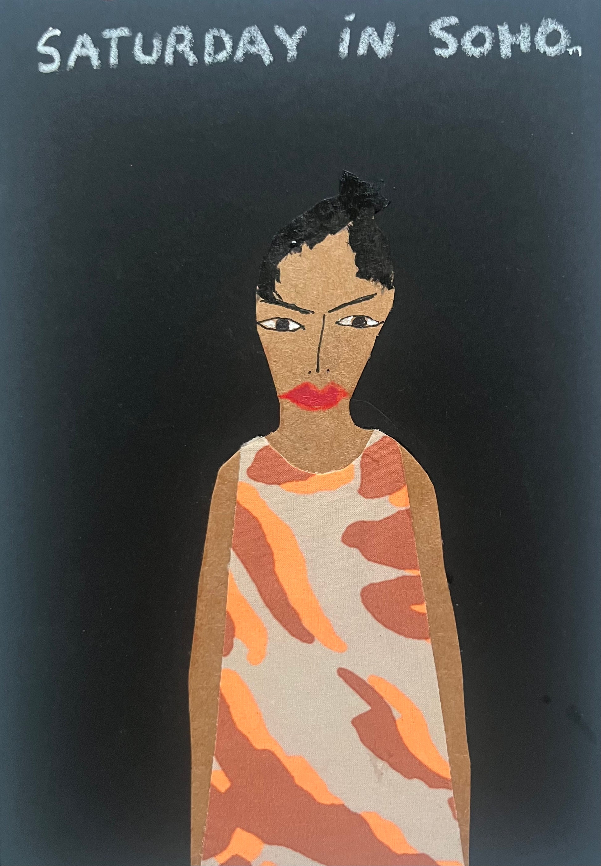 Oil pastel, paper/fabric collage, ink cut-out drawings decoupage on black museum board 5x7 inches